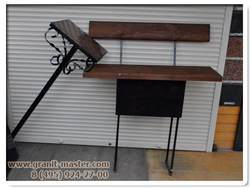 Стол металлический. Материал исполнения верха - гранитная плита (40х40х2 см). Стоимость данного образца: 3000 руб. Лавка со спинкой и ящиком. Материал исполнения верха - сосна. Стоимость данного образца: 3500 руб.
