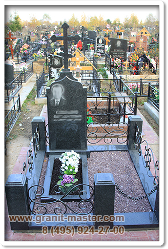 Размер : 1,8х2,0 метра Материал исполнения : цоколь, памятник, цветник - габбро-диабаз (Карелия) декоративная гранитная крошка "Яшма" Элементы ковки Установлен на кладбище ЗАО "Горбрус" Красногорского района