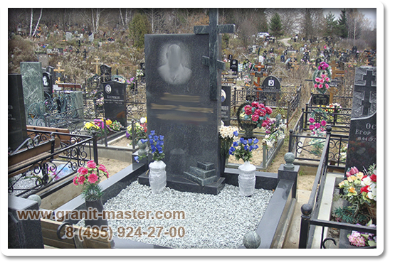 Размер : 1,8х2,0 метра Материал исполнения : Цоколь, подставка, памятник - габбро-диабаз (Карелия) Крест, ступеньки, шар на ножке - змеевик (Урал) Установлен на Митинском кладбище г. Москвы.